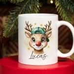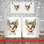Christmas Reindeer PNG Mug, Xmas Kids Custom Name PNG Mug, Christmas Sublimation Mug, Transfer Wrap Mug Template, Reindeer with Ball cap PNG
