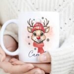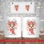 Christmas Reindeer PNG Mug, Xmas Kids Custom Name PNG Mug, Christmas Sublimation Mug, Transfer Wrap Mug Template, Winter Hat Reindeer PNG.