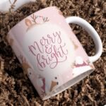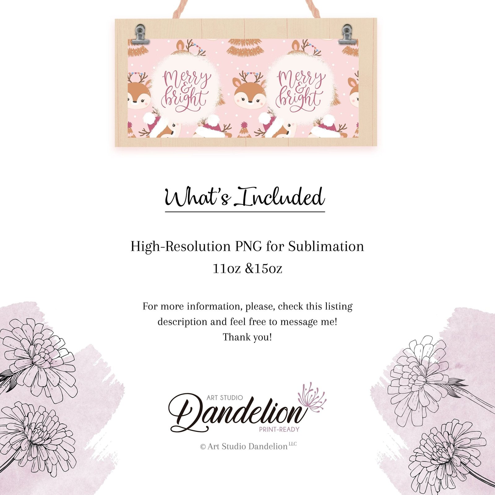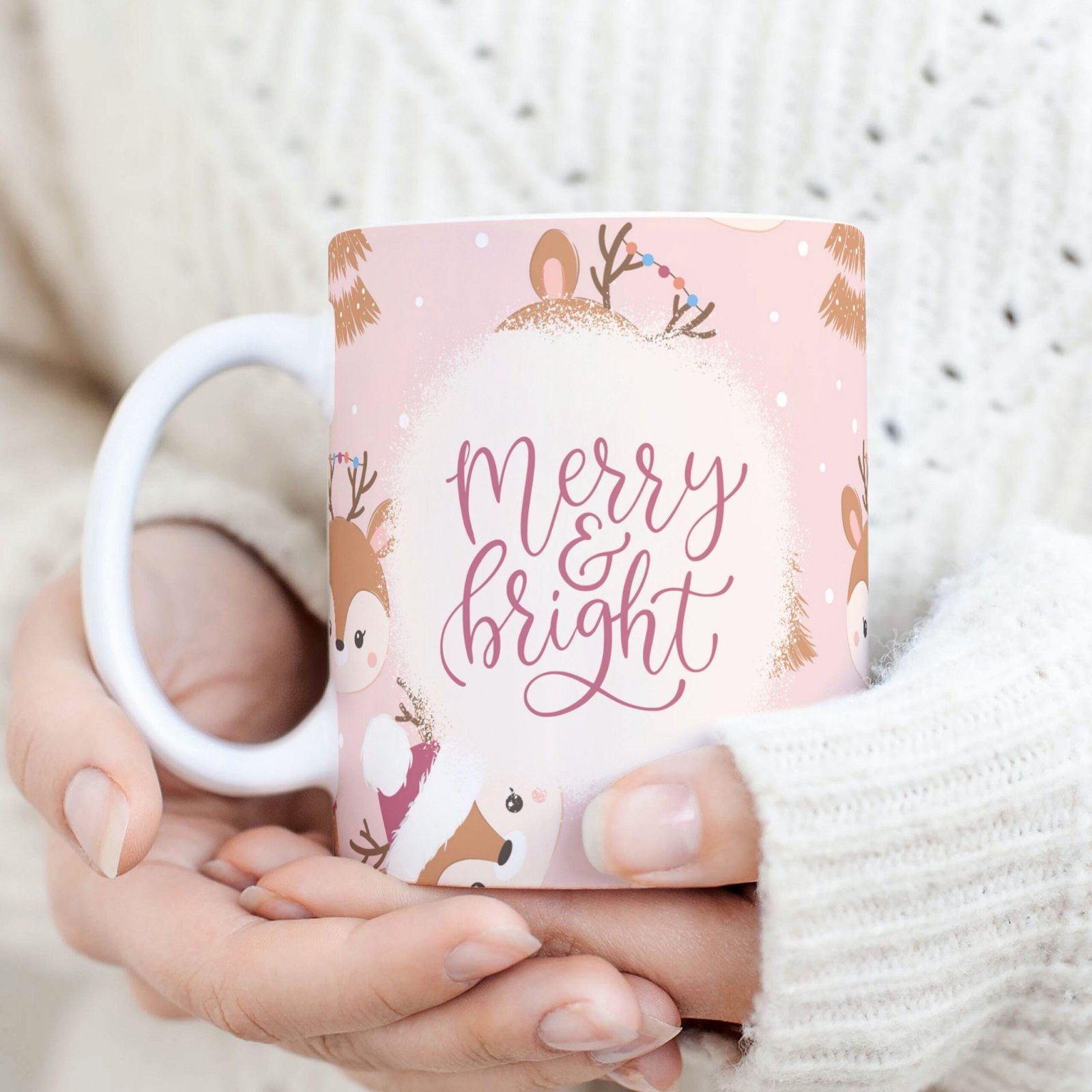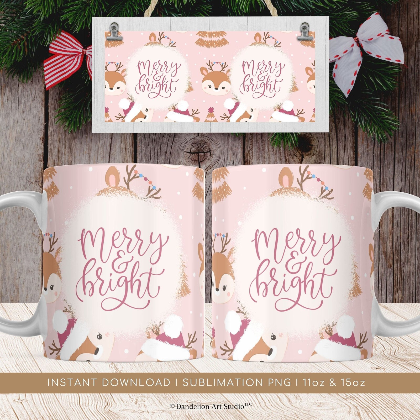 Merry and Bright Christmas Mug Sublimation PNG, Cute Deer Christmas Pattern Mug PNG, Transfer Mug Press, Wrap Template, Instant Download.