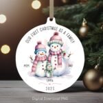 1st Christmas as a Family Round Ornament PNG, Personalized Christmas Snowman Family Ornament, Xmas Sublimation Template, Instant Download.