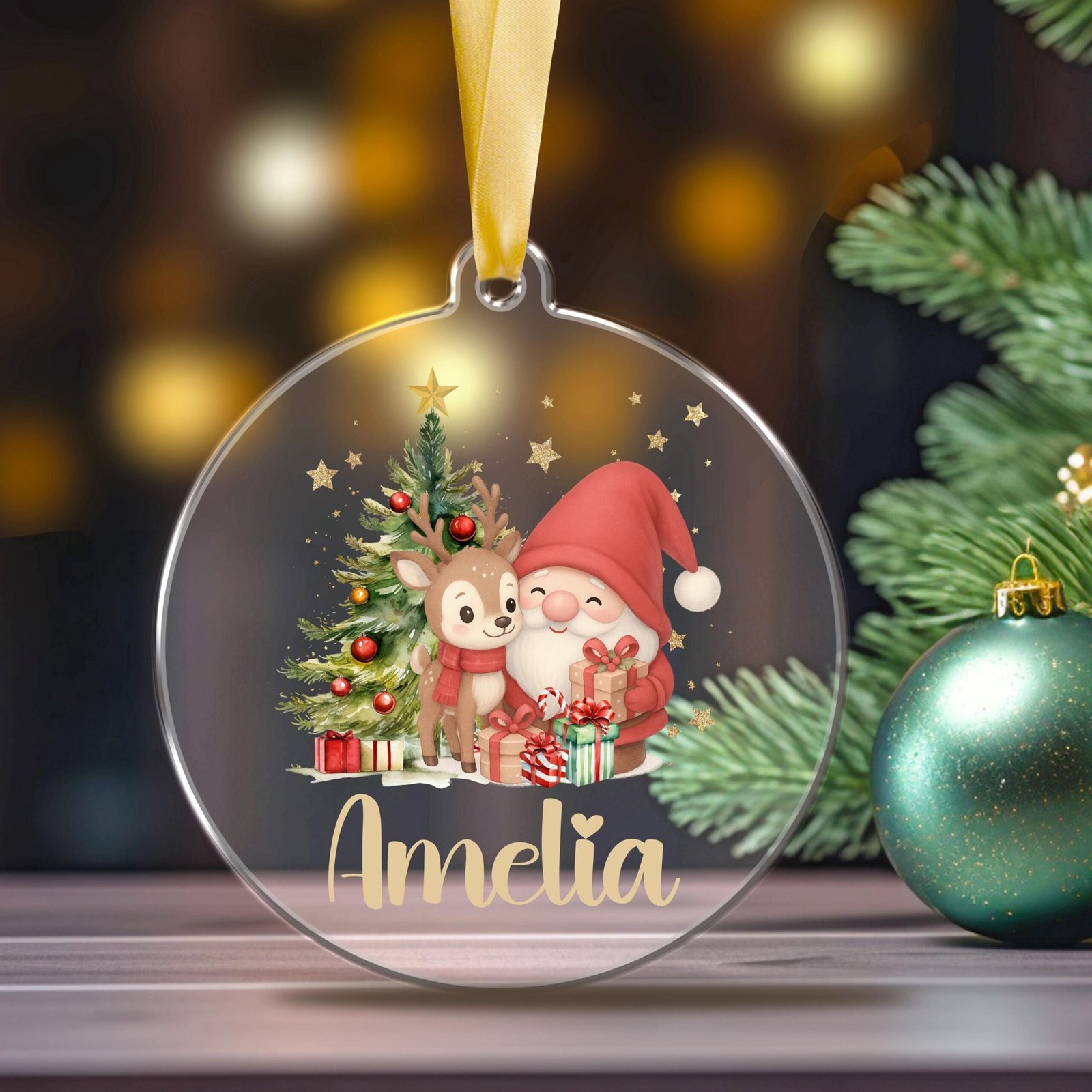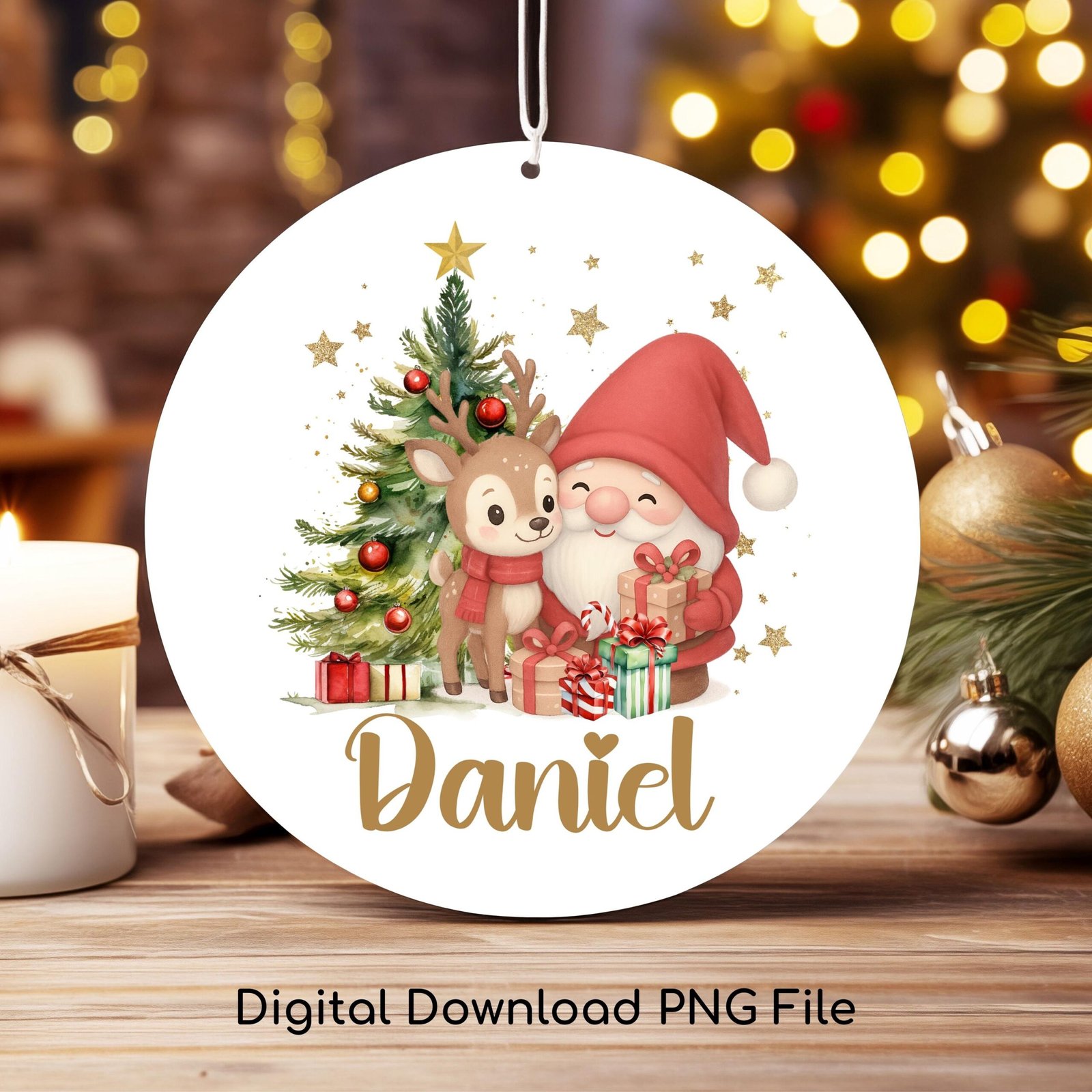 Christmas PNG File, Printable Santa Gnome, Personalized Round Ornament PNG, Kids Custom Name Design, Xmas Deer Keepsake, Digital Download.