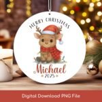Christmas PNG File, Santa Baby Deer Printable Design, Personalized Round Ornament PNG, Kids Custom Name Xmas Keepsake, Digital Download.