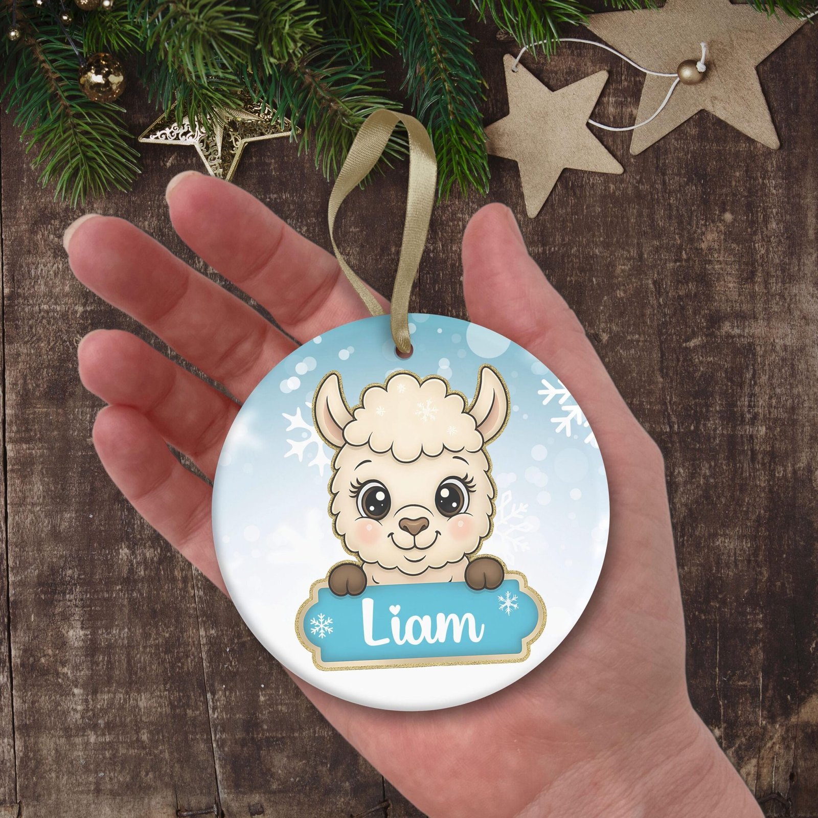 Christmas PNG File, Winter Cute Llama PNG, Xmas Keepsake Sublimation, Kids Custom Name Round Ornament PNG, Baby Llama Digital Download.