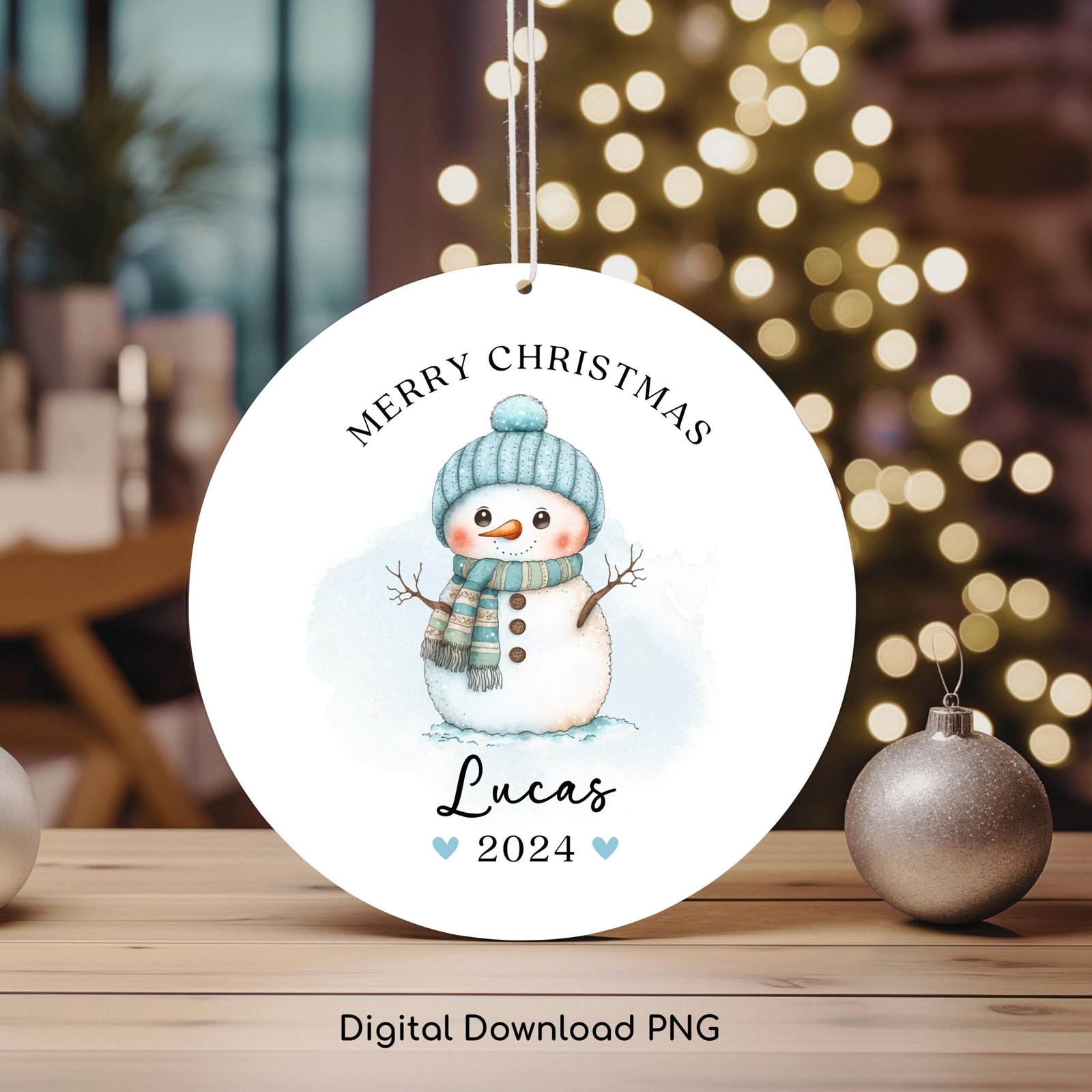 Christmas PNG Personalized Ornament, Christmas Snowman PNG, Merry Christmas Keepsake Sublimation Template, Kids Custom Name PNG Design.