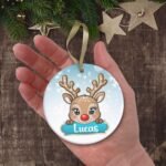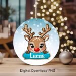 Christmas PNG Personalized Ornament, Winter Blue Reindeer PNG, Christmas Keepsake Sublimation, Kids Custom Name Frame PNG, Digital Download.