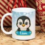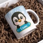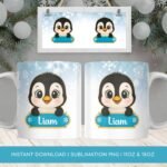 Digital Design PNG Mug, Xmas Kids Custom Name PNG Mug, Christmas Cute Penguin Sublimation Mug, Transfer Wrap Mug Template, Blue Xmas PNG.