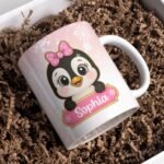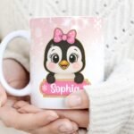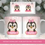 Digital Design PNG Mug, Xmas Kids Custom Name PNG Mug, Christmas Cute Penguin Sublimation Mug, Transfer Wrap Mug Template, Pink Xmas PNG.