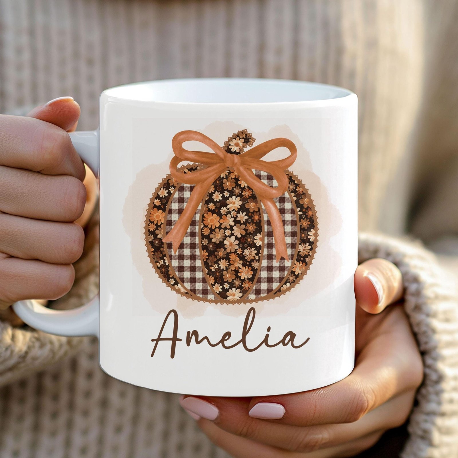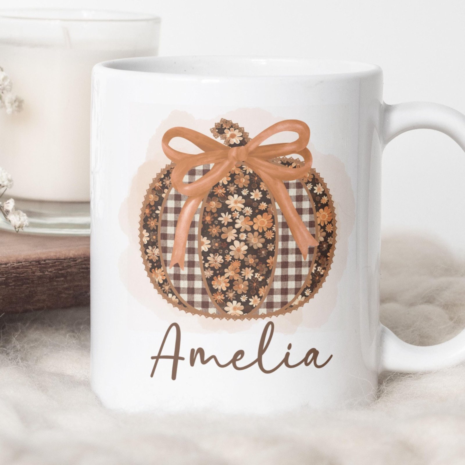 Floral Pumpkin Mug Wrap, Custom Name Sublimation Mug, Coquette Bow PNG Mug, Thanksgiving Mug Transfers 11oz & 15oz, Fall Flowers PNG Mug.