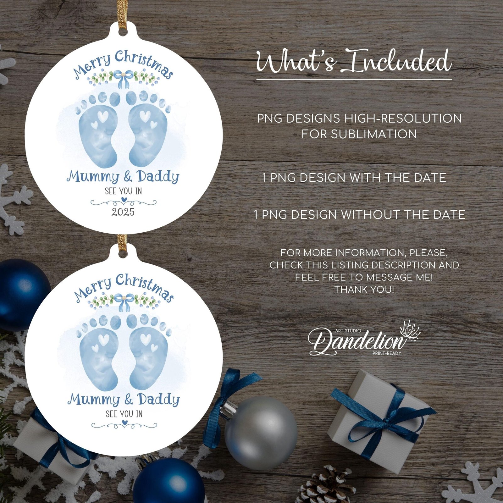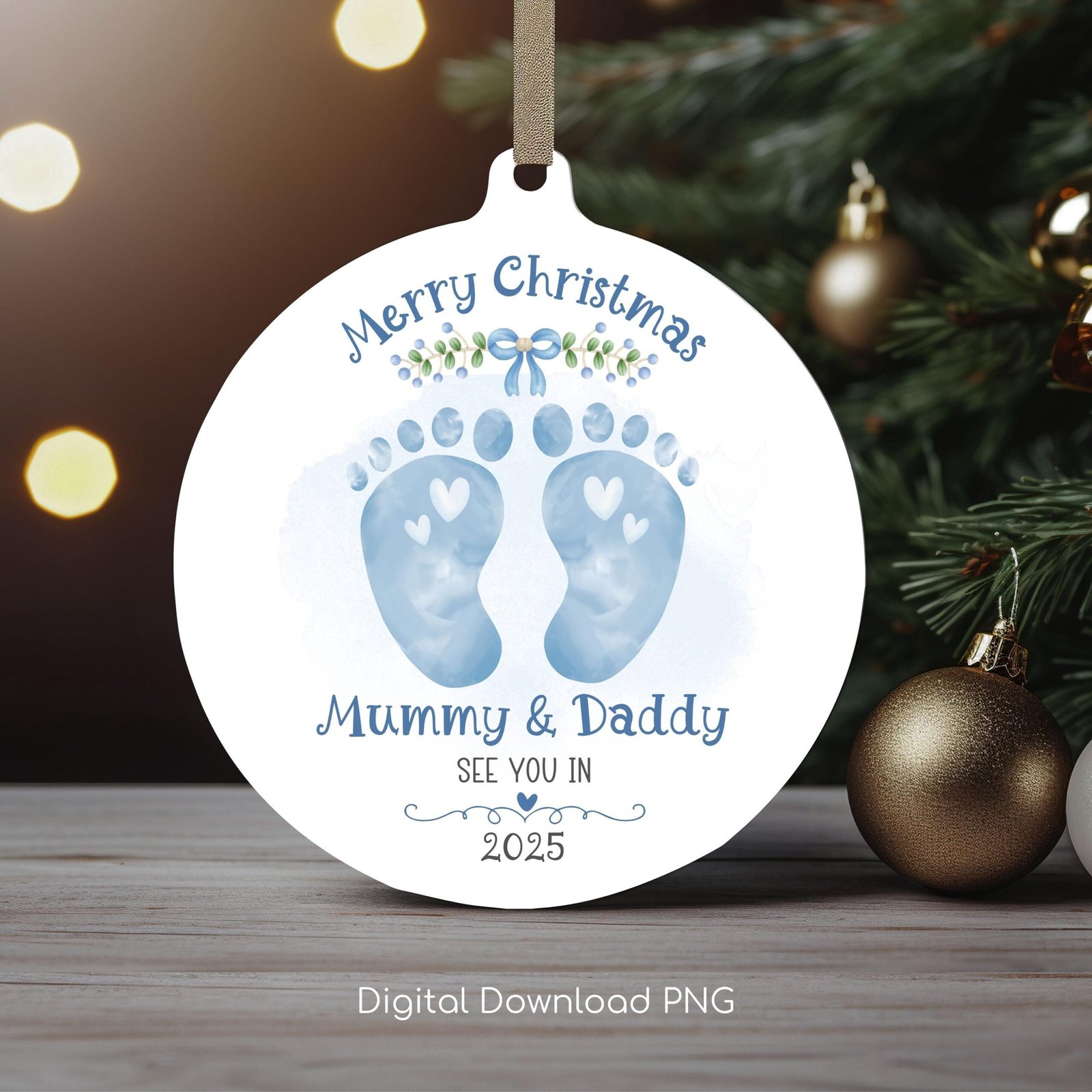 Mummy and Daddy Christmas Ornament PNG, Pregnancy Announcement PNG, Xmas Sublimation Bauble, Baby Footprint Ornament, Xmas Keepsake Wrap.