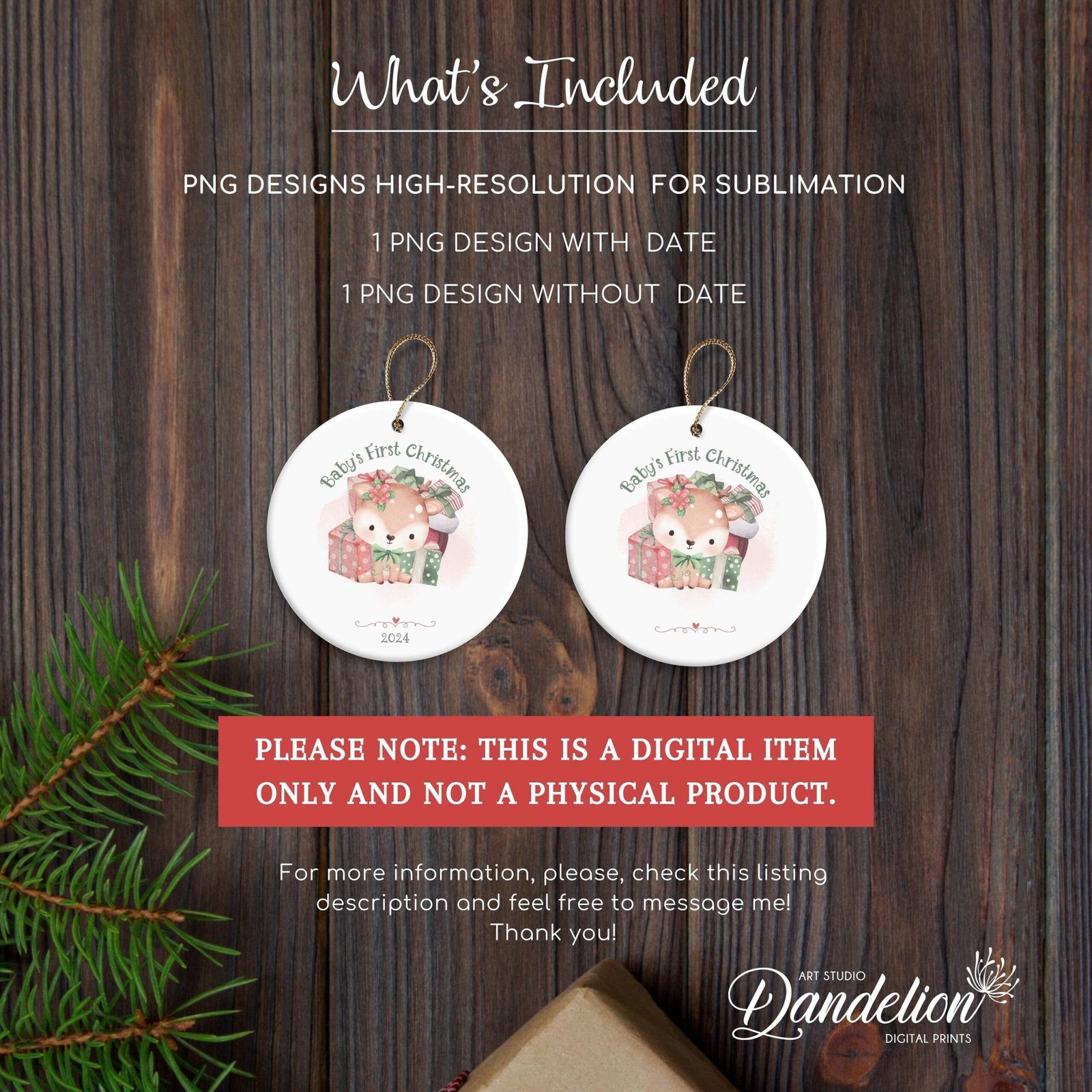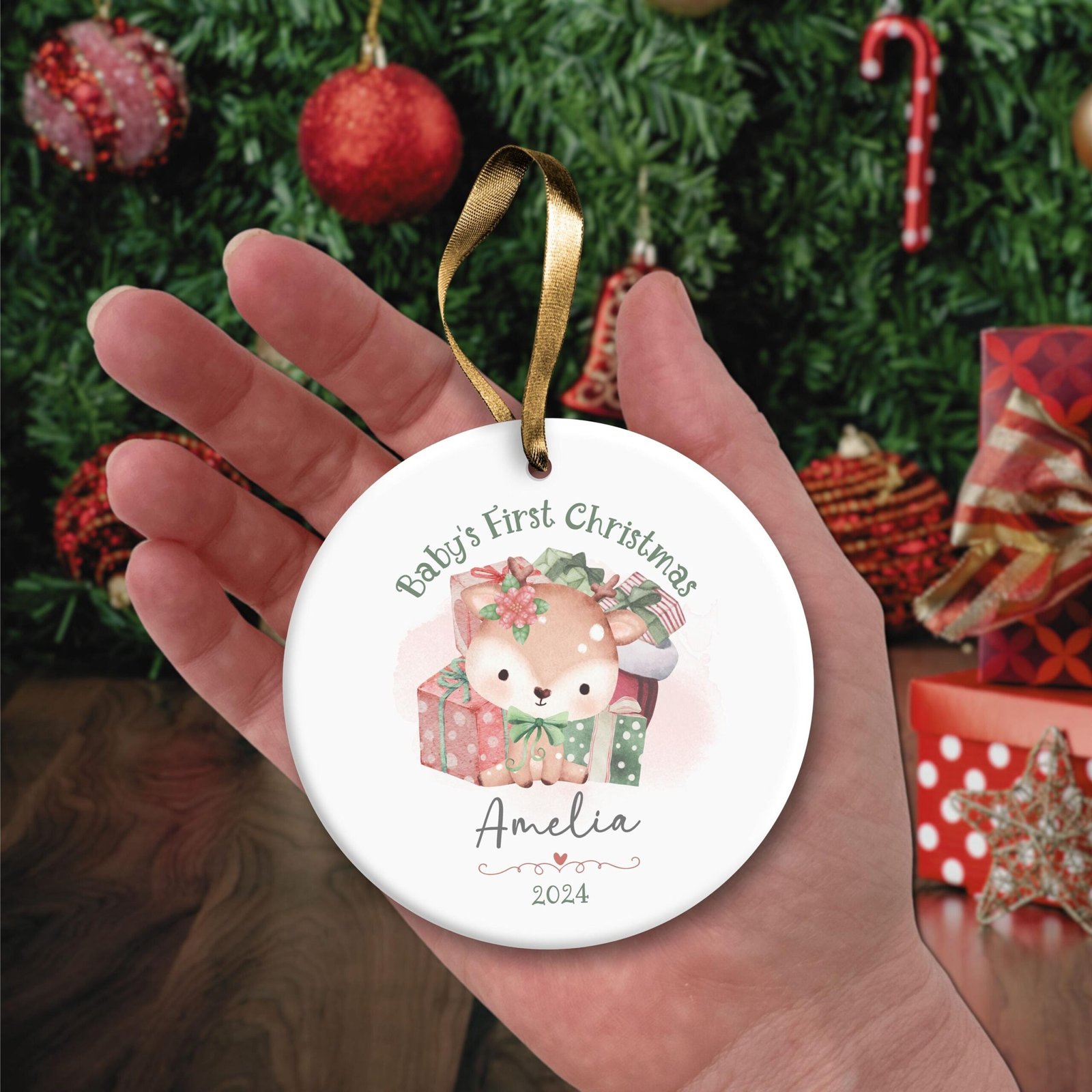 Personalized Baby’s 1st Christmas Ornament, Cute Baby Deer Keepsake PNG, Xmas Round Ornament Sublimation, Custom Name Christmas Bauble PNG.