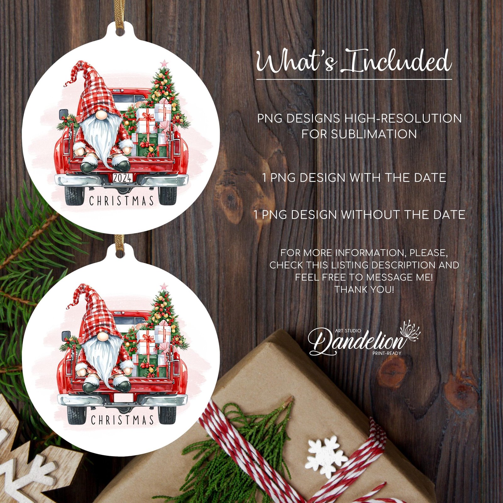 Personalized Christmas Ornament, Xmas Gnome Truck PNG, Christmas Keepsake Sublimation Template, PNG Wrap Transfers Design, Xmas Bauble PNG.