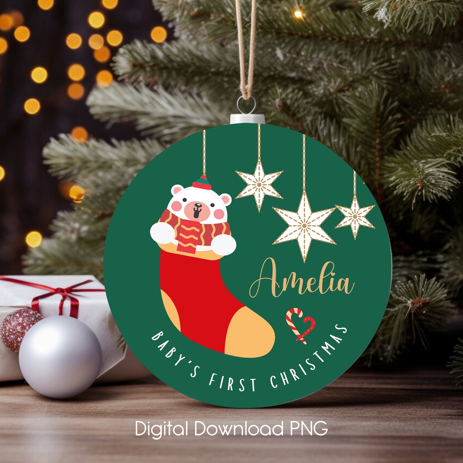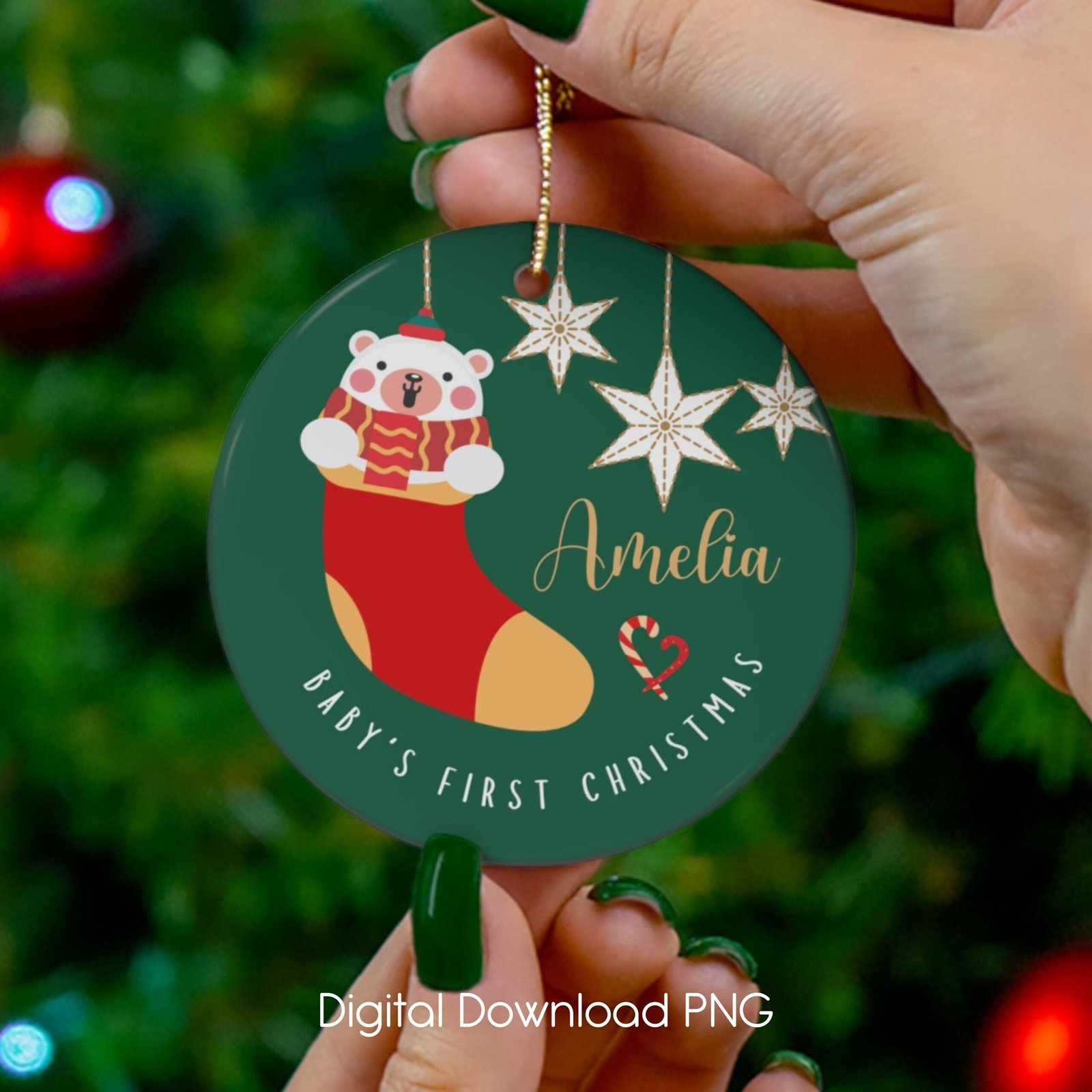 Round First Christmas Ornament, Baby Bear PNG Instant Download, Christmas Socks Sublimation Ornament, Wrap Transfers Design-High-Resolution.