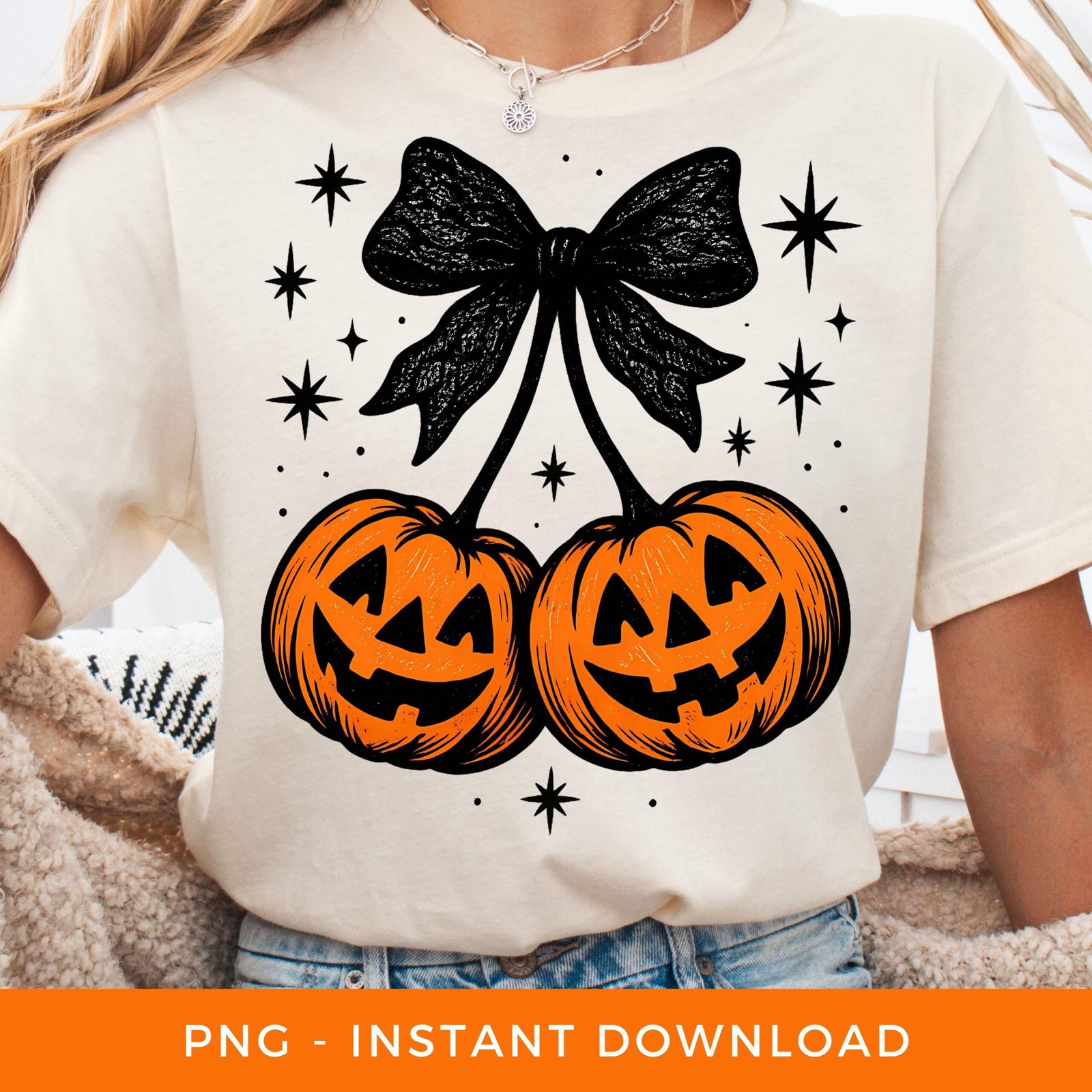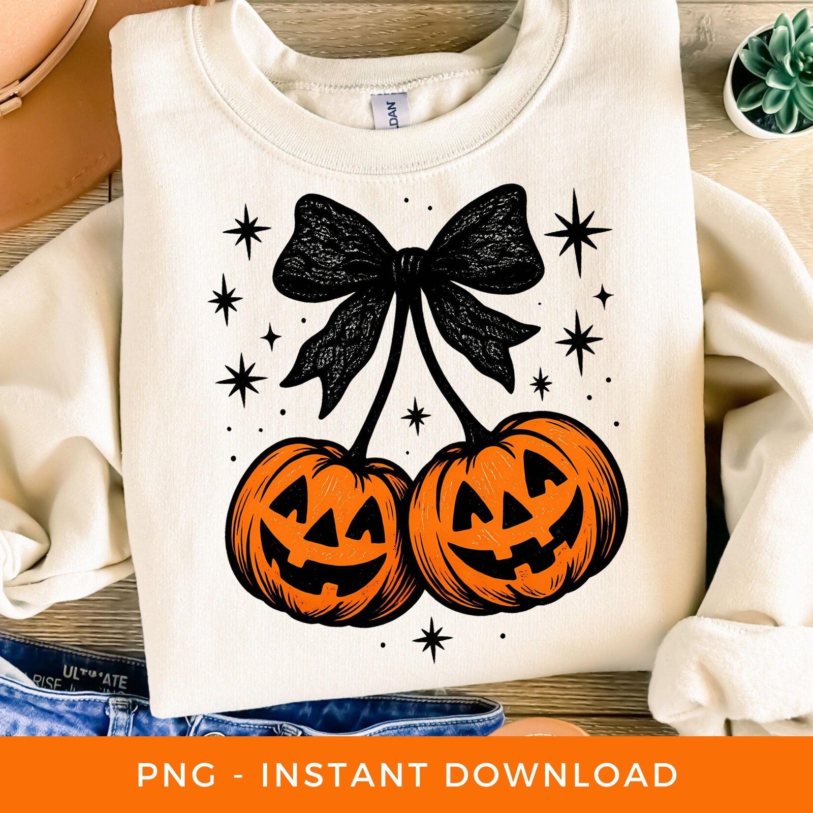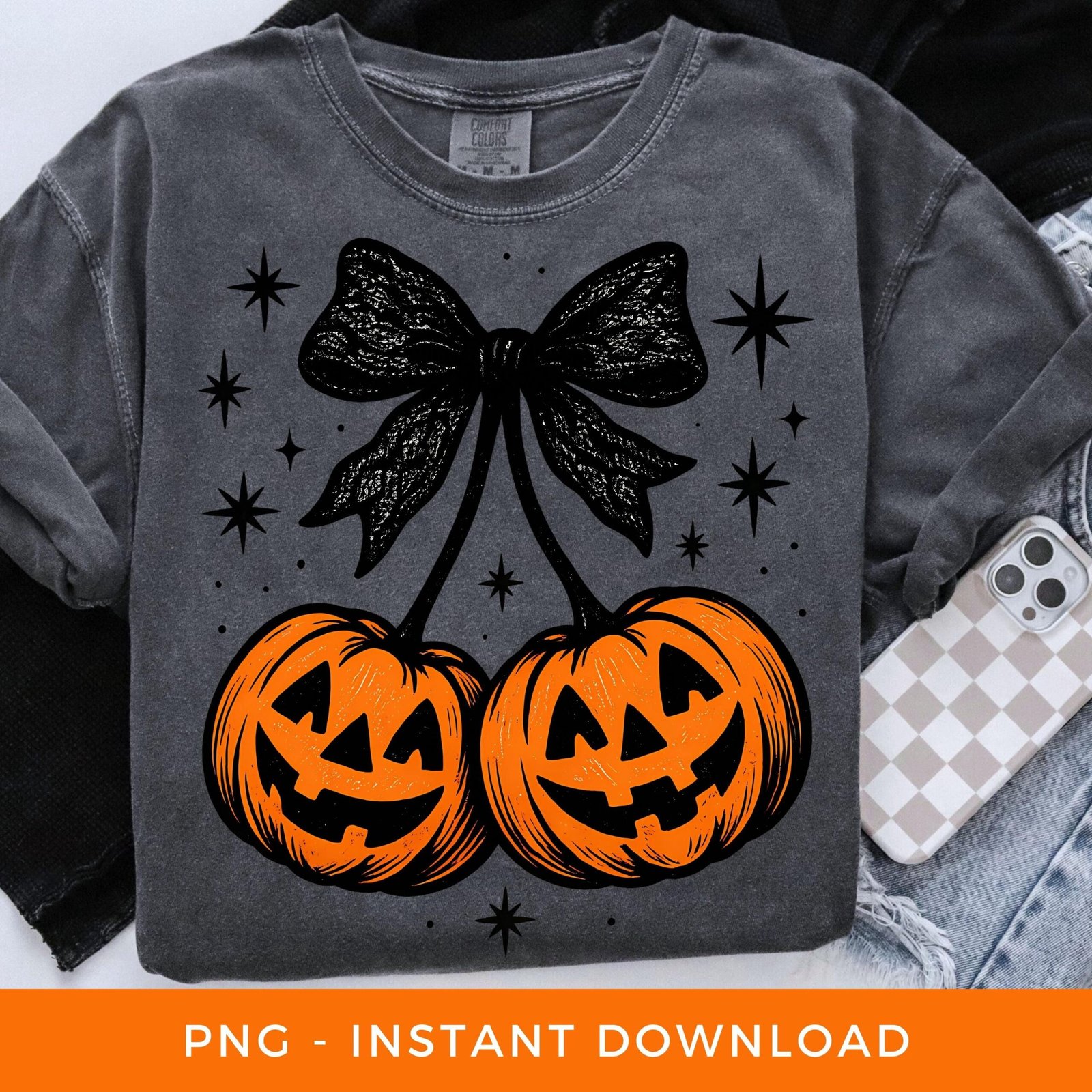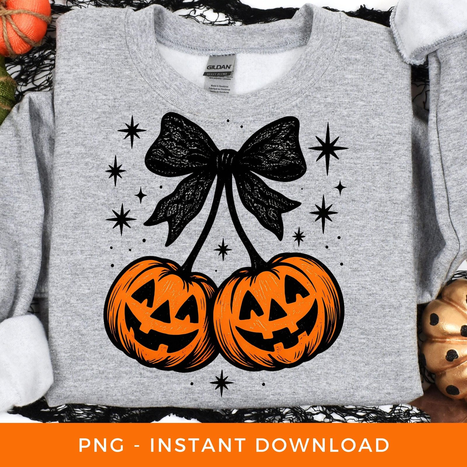 Halloween PNG, Pumpkin Cherries Sublimation, Spooky Season DTF, Fall PNG, Cherry Coquette Bow Clipart, Autumn Girly Png, Digital Download