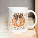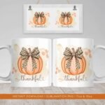 Pumpkin Leopard Bow Mug PNG, Autumn Mug Sublimation, Pumpkin Coquette Mug PNG, Thanksgiving Mug Transfer Wrap Design, Fall Season PNG Mug.