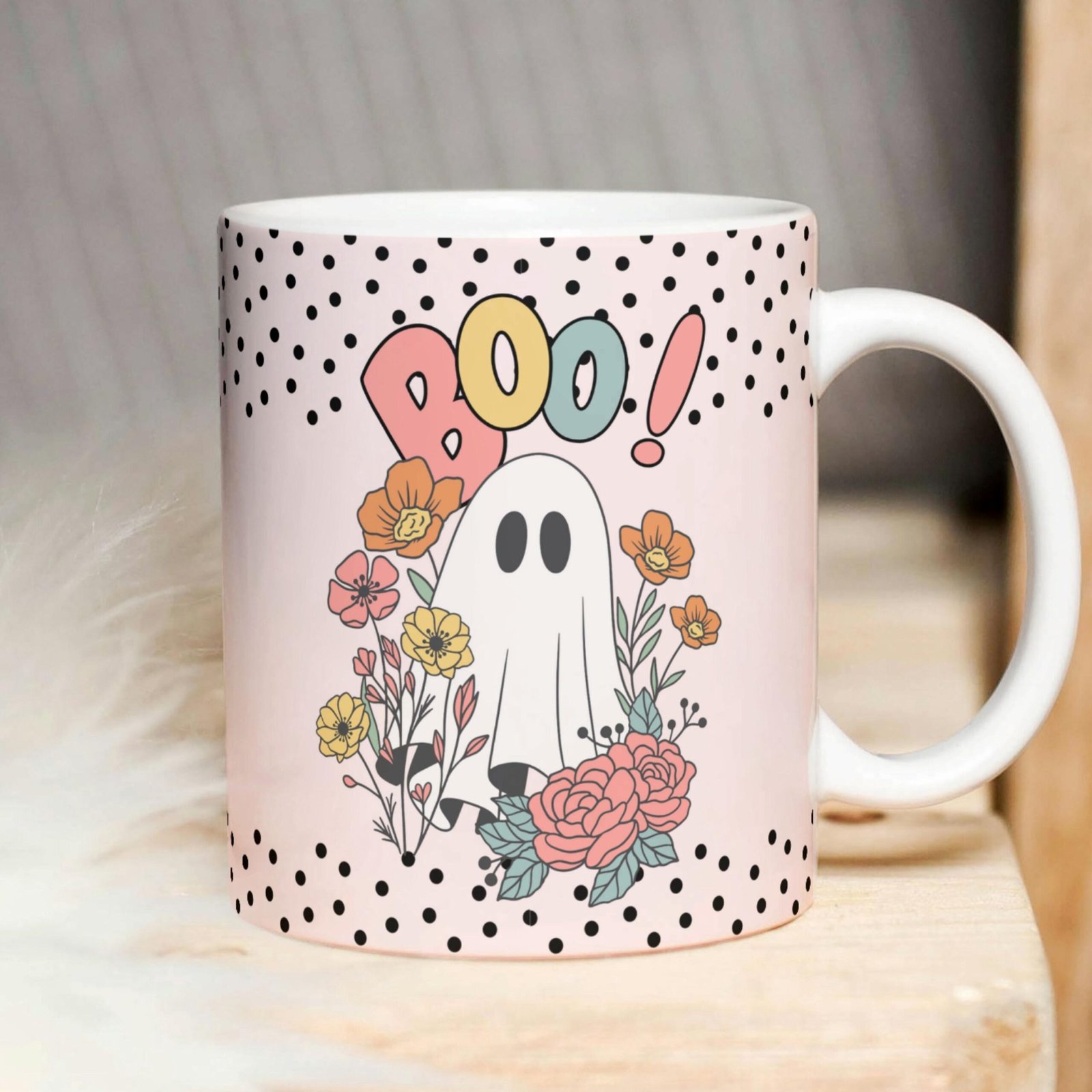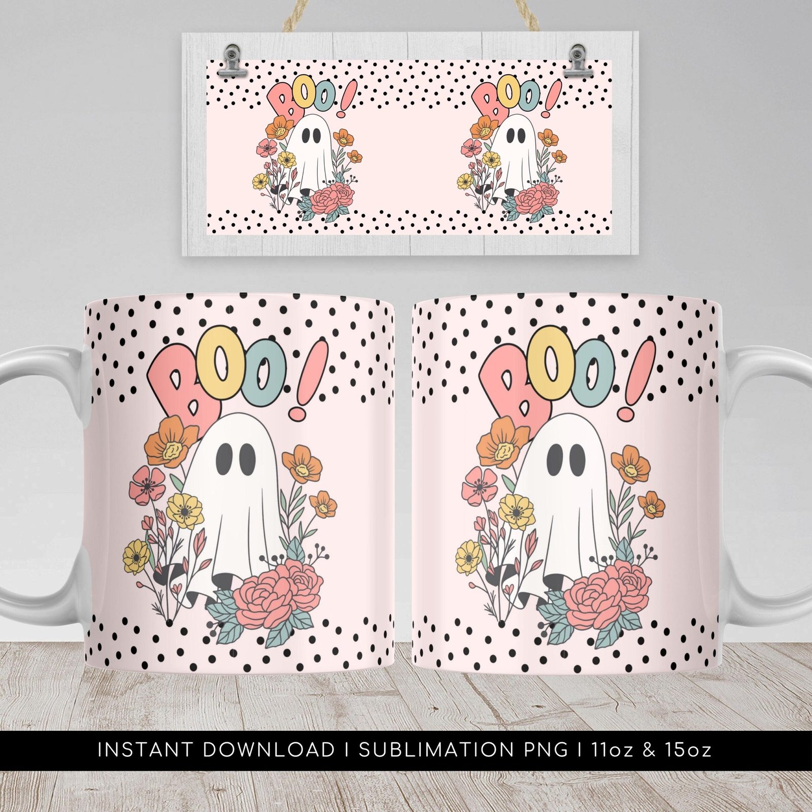 Retro Floral Ghost PNG Mug, Cute Halloween Mug PNG, Vintage Ghost Sublimation Mug, Spooky Season Wrap Transfers 11oz & 15oz, Boo PNG Mug.