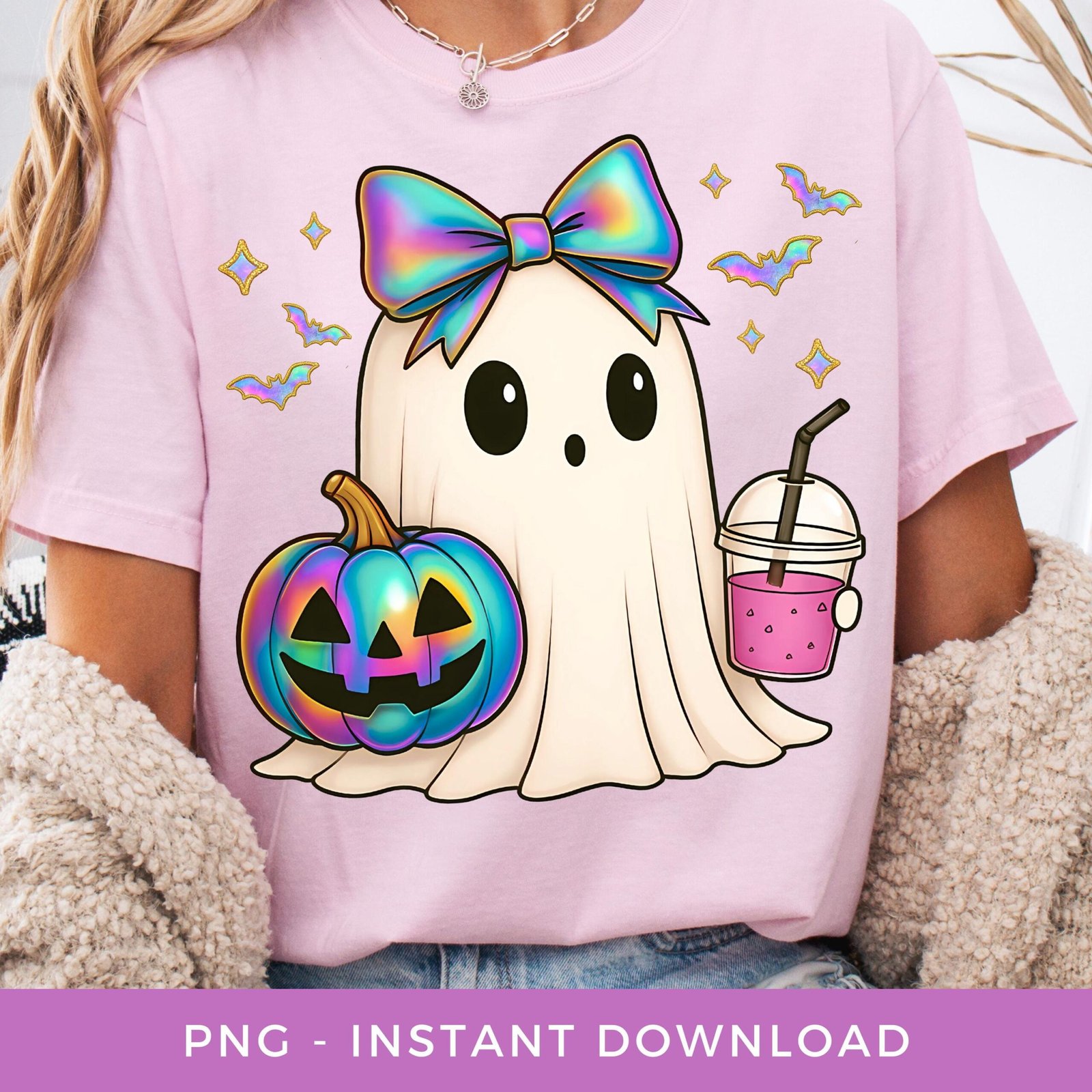 Cute Ghost PNG, Halloween Sublimation, Iridescent Pumpkin Clipart, Girly Ghost Shirt PNG, Printable Spooky Season. Fall Coquette Bow PNG.