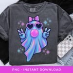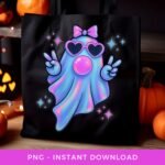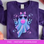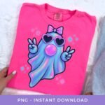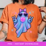 Neon Ghost PNG, Halloween Sublimation, Ghost Blowing Bubble Clipart, Girly Fall Shirt PNG, Printable Spooky Season. Pink Coquette Bow PNG.