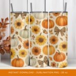 Pumpkin Tumbler Wrap, Fall Floral PNG Tumbler, Autumn Tumbler Sublimation, Sunflowers Pattern 20oz Tumbler Design, Digital Download.