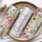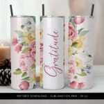 Gratitude Tumbler Sublimation PNG, Watercolor Flowers Tumbler PNG, Tumbler Wrap 20 oz, Skinny Tumbler PNG File Design – Instant Download.