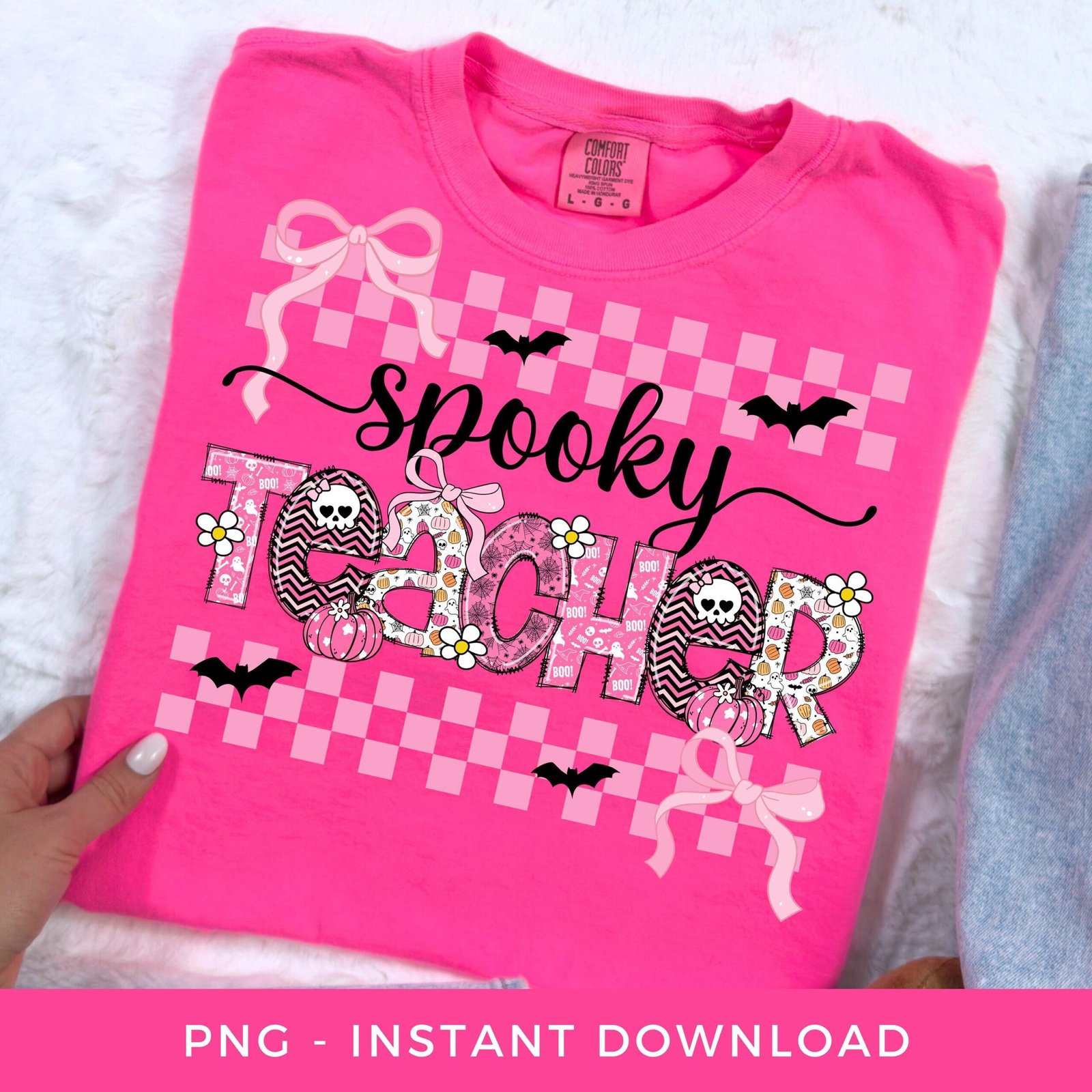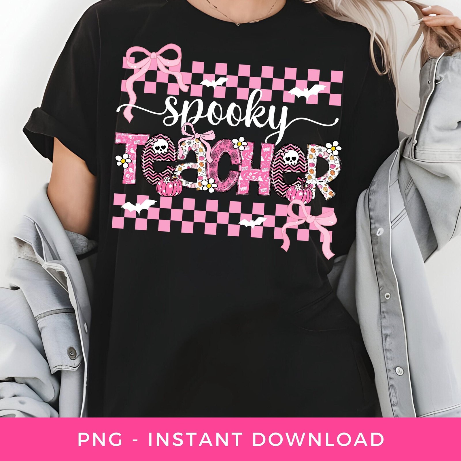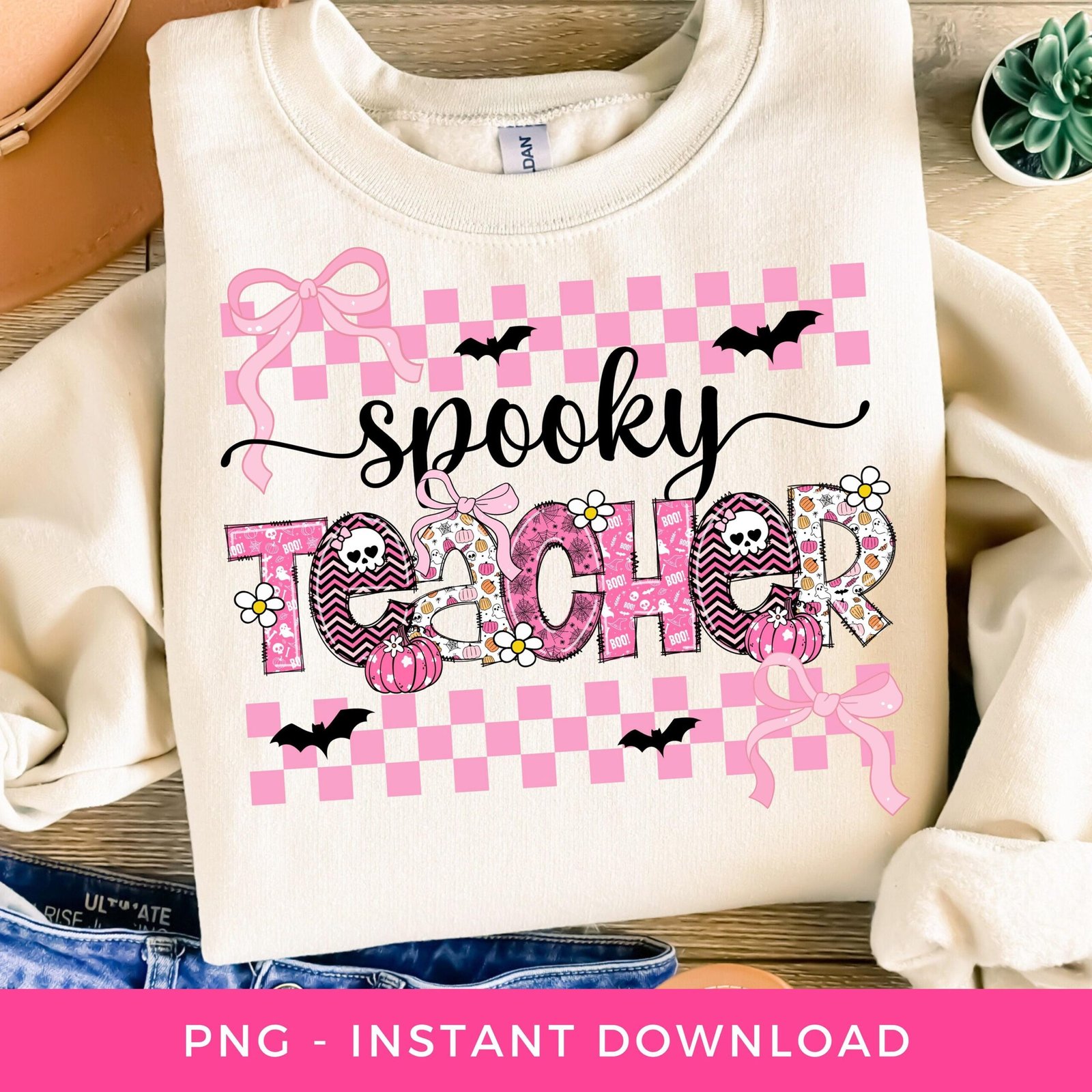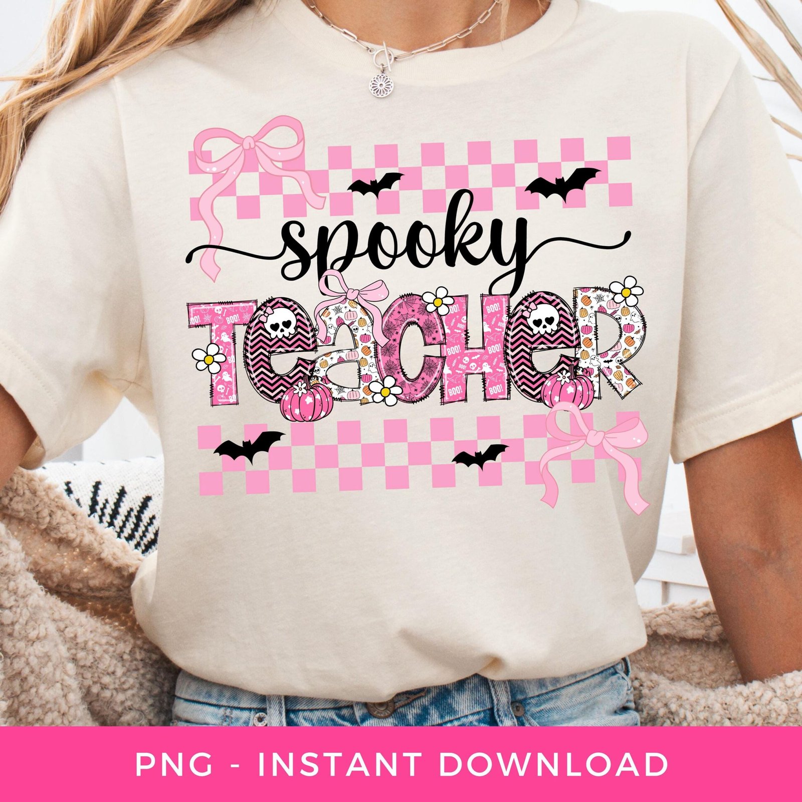 Spooky Teacher PNG, Pumpkin Fall School Clipart, Preppy Halloween PNG, Pink Teacher Checkered Coquette Bow Png, Girly Teacher Doodle Png.